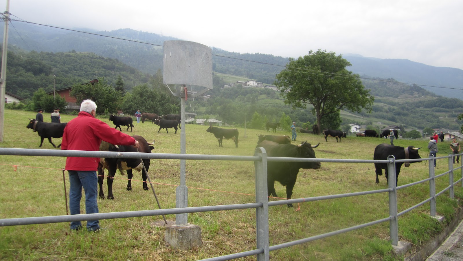 I walked up to one of the old guys and asked him what was going on. He said they were letting the cows outside to shake their legs out before going up to the alpeggio. They'd been cooped up all winter and they needed time to go crazy, completely nuts, before making the trek up the mountain. I'm not sure why it turned into a party...I think parties happen whenever the cows butt heads and the guys carry sticks.